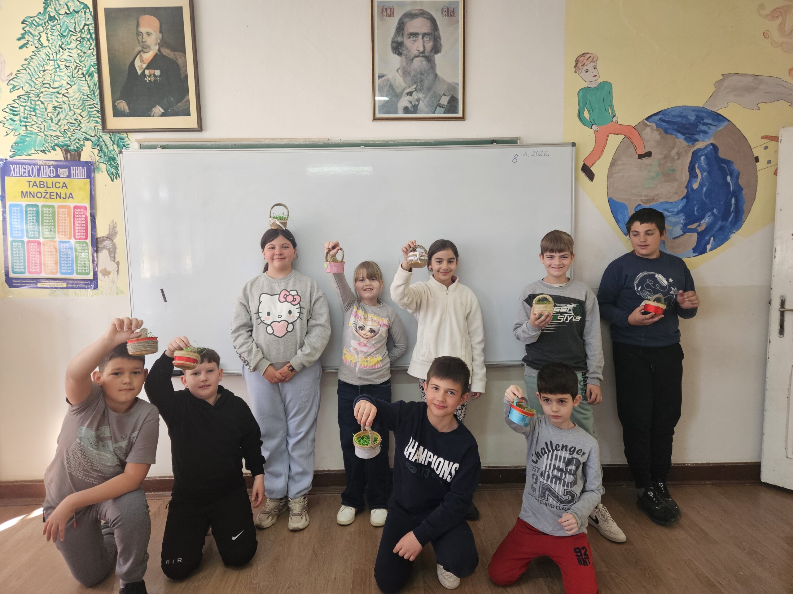 У продуженом боравку наше школе одржана је ускршња радионица. Ученици су заједно са учитељицама Тамаром Тонић и Биљаном Милићевић фарбали јаја која су стрпљиво чекала своје корпице.