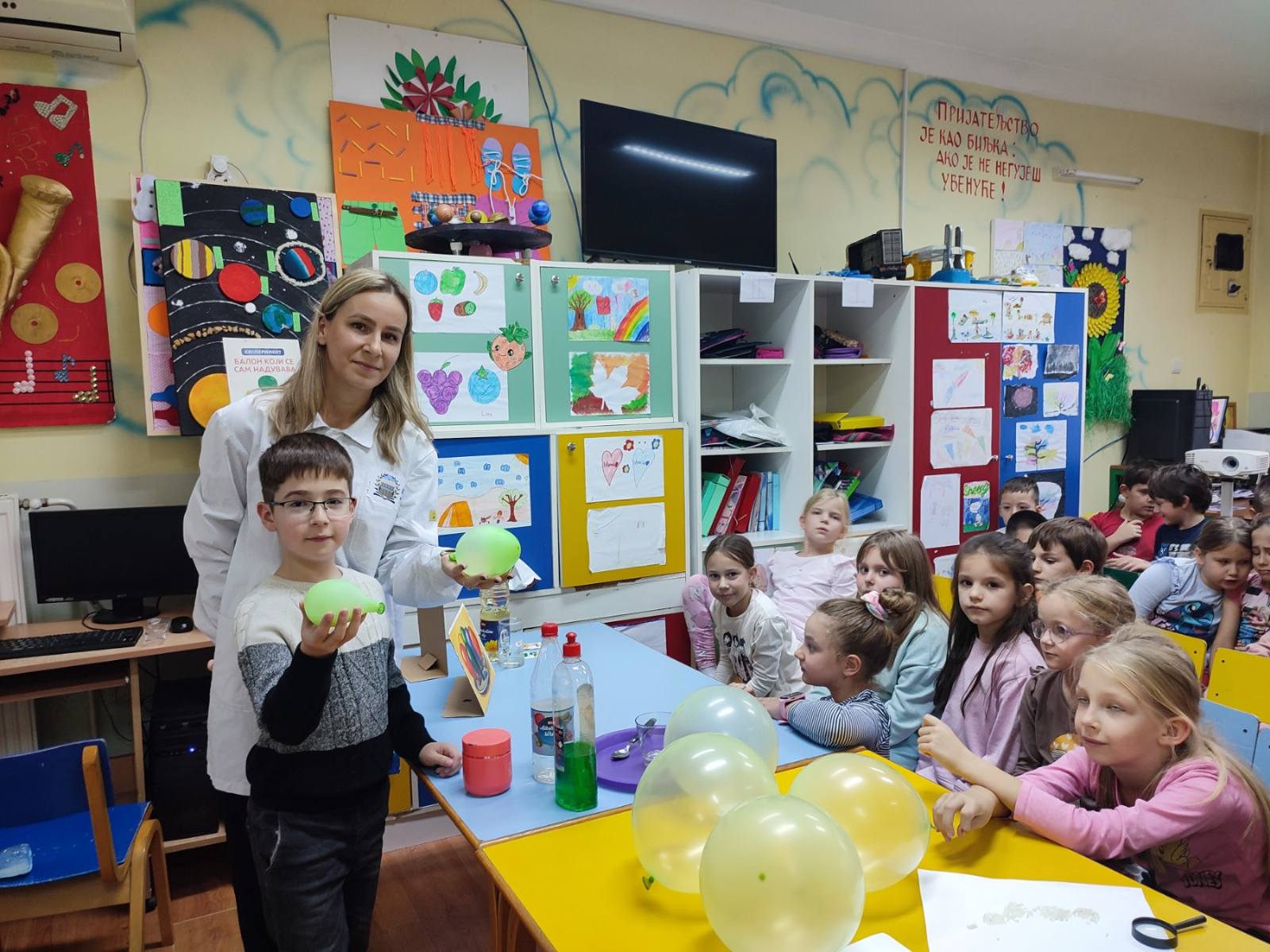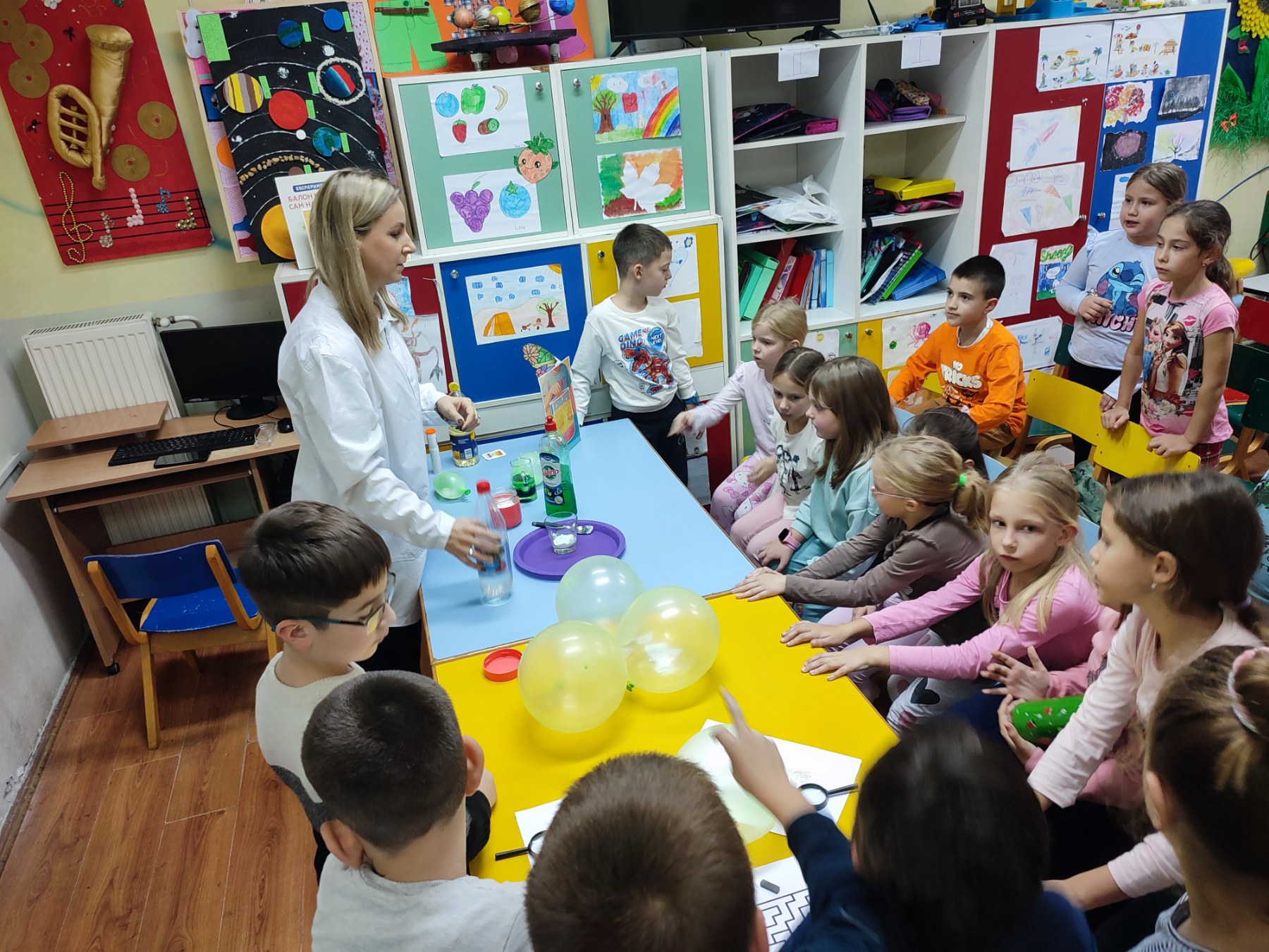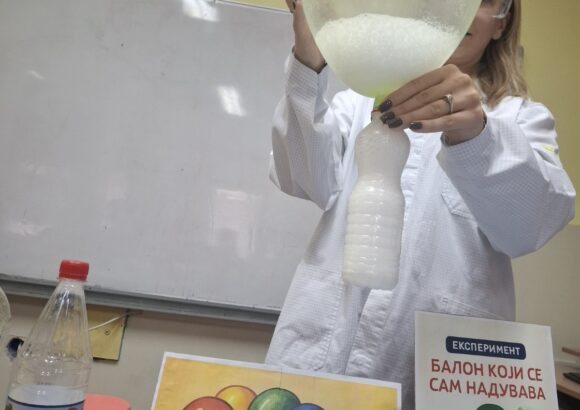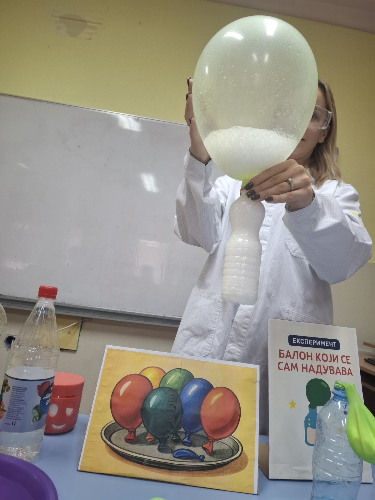 Балон који се сам надувава — уз помоћ соде бикарбоне и сирћета, деца су посматрала како хемијска реакција пуни балон без дувања.