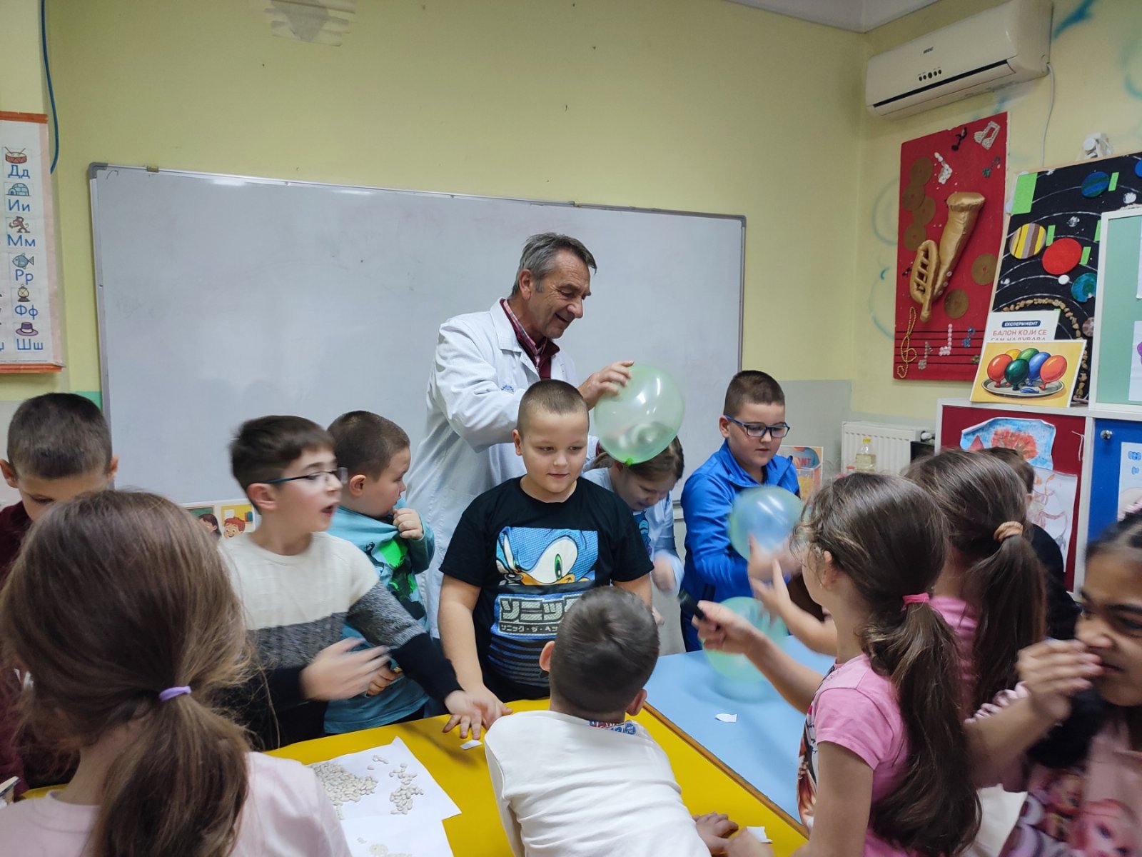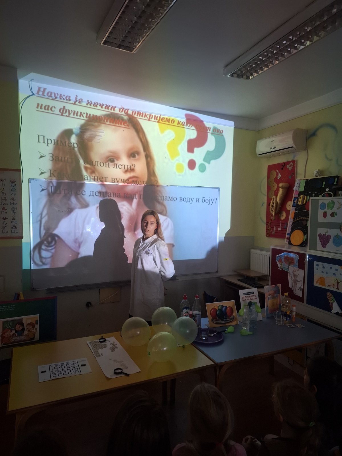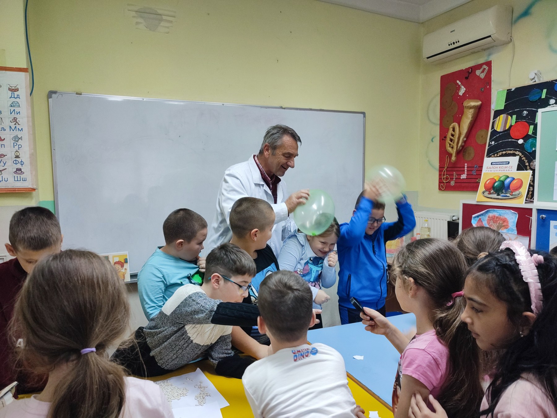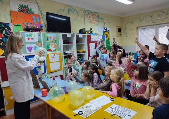 Балон који се сам надувава — уз помоћ соде бикарбоне и сирћета, деца су посматрала како хемијска реакција пуни балон без дувања.