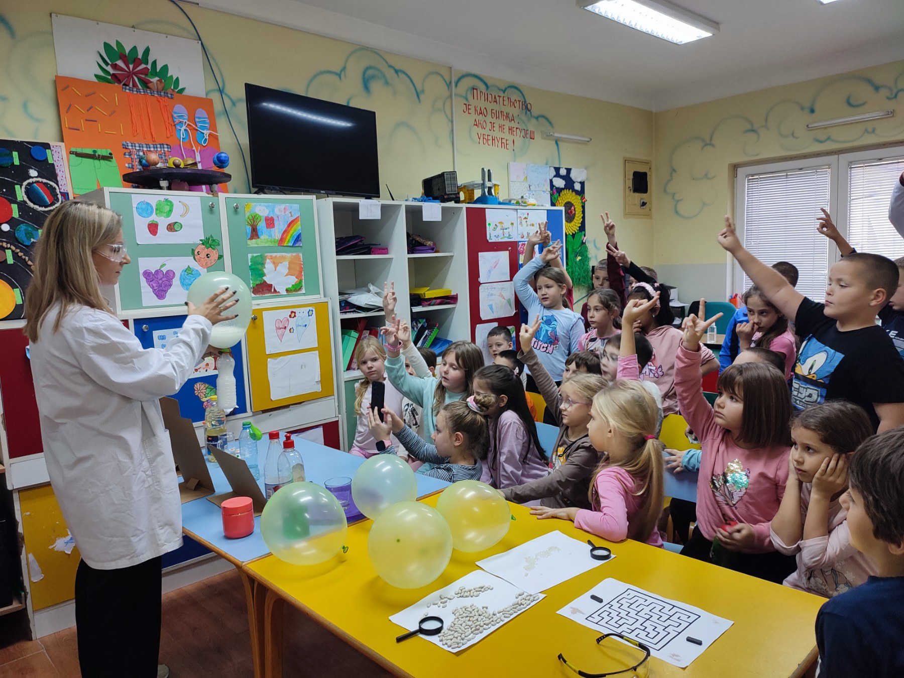 Лава у чаши — мешањем воде са бојом, уља и таблете витамина Ц, у чаши су се стварали мехурићи и таласи који су личили на лаву, што је деци било веома занимљиво и забавно.