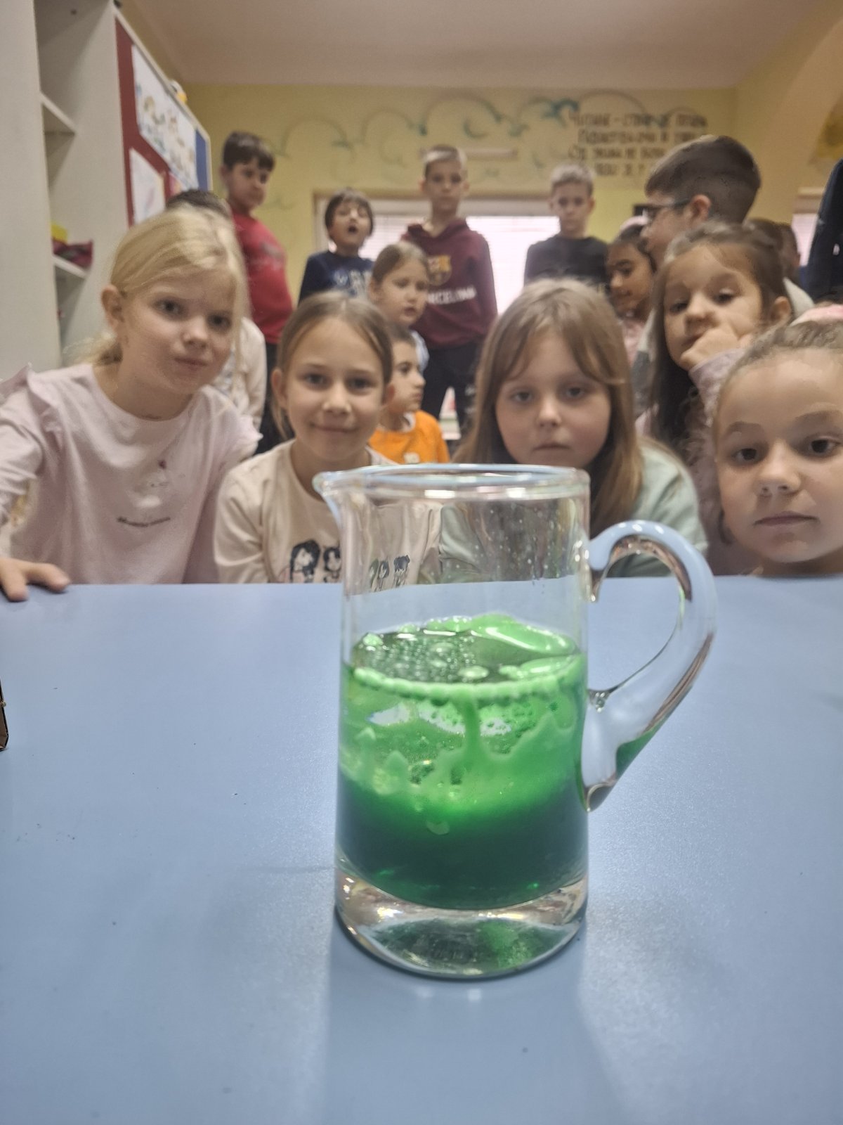 Судомил, сода бикарбона и сирће — мешањем ових састојака дошло је до хемијске реакције праћене стварањем пене и мехурића, што је код деце изазвало велико интересовање и радост.
