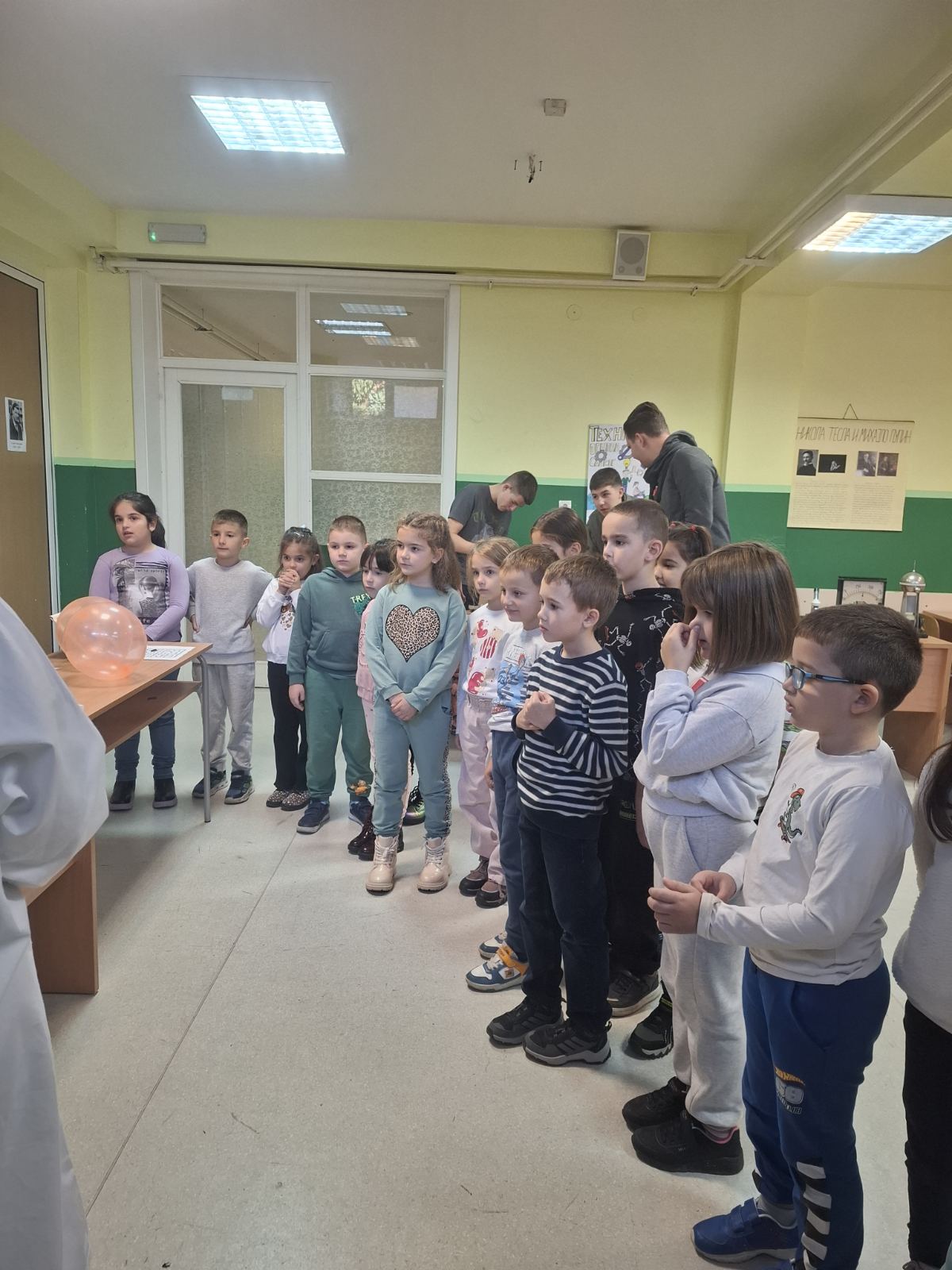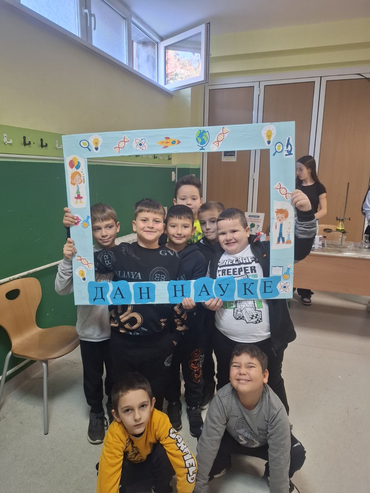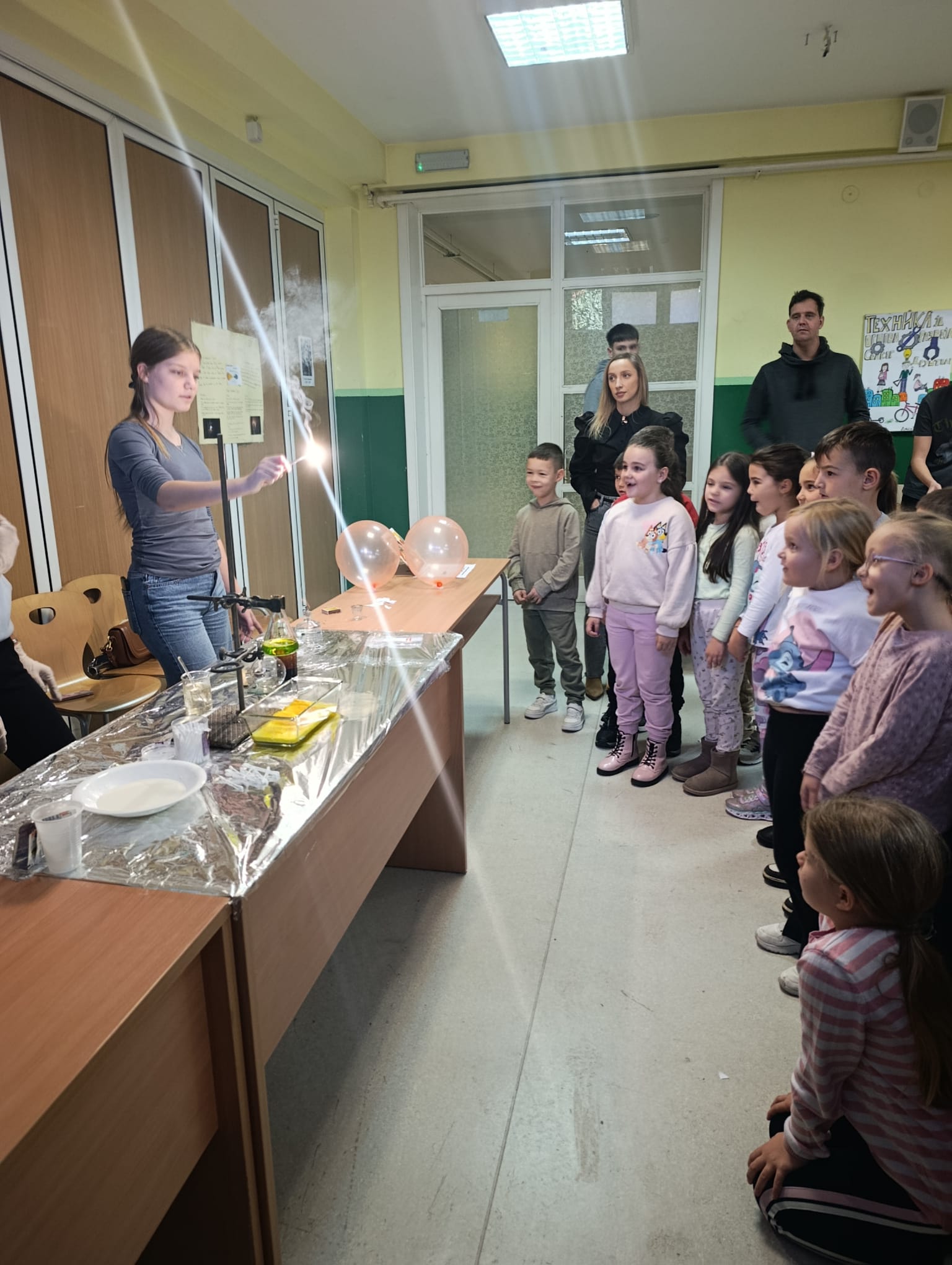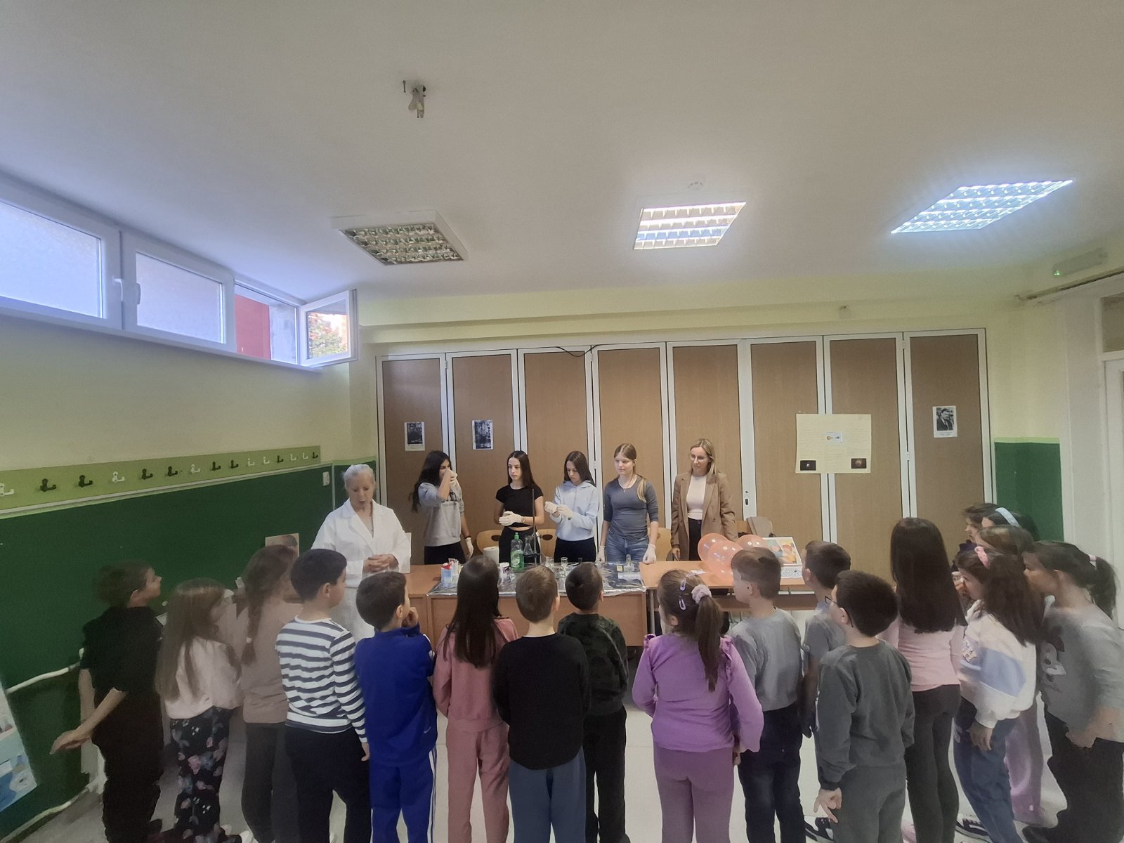 У нашој школи обележили смо Дан науке кроз занимљиве активности за све ученике. Са млађим разредима извођени су узбудљиви експерименти: палили смо магнезијум, правили слонову пасту, чаробно млеко, балон који се сам надувава, лаву у чаши, наелектрисали балоне и померали магнете кроз лавиринт. Деца су такође разгледала изложбу модела направљених од рециклираних материјала: ауто, анемометар, роботску руку, фиксни телефон од картона, као и клатно, перископ, микроскоп и анатомски модел људског тела. Уз велико стрпљење и ангажовање, ученици старијих разреда су демонстрирали рад инструмената и макета, одговарајући на питања млађих и подстичући њихову радозналост. Деца су показала велико интересовање и жељу за извођењем експеримената и разгледањем макета. Све је било забавно, поучно и подстицало дечју радозналост.
