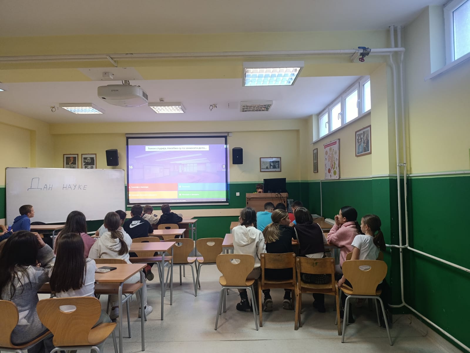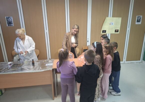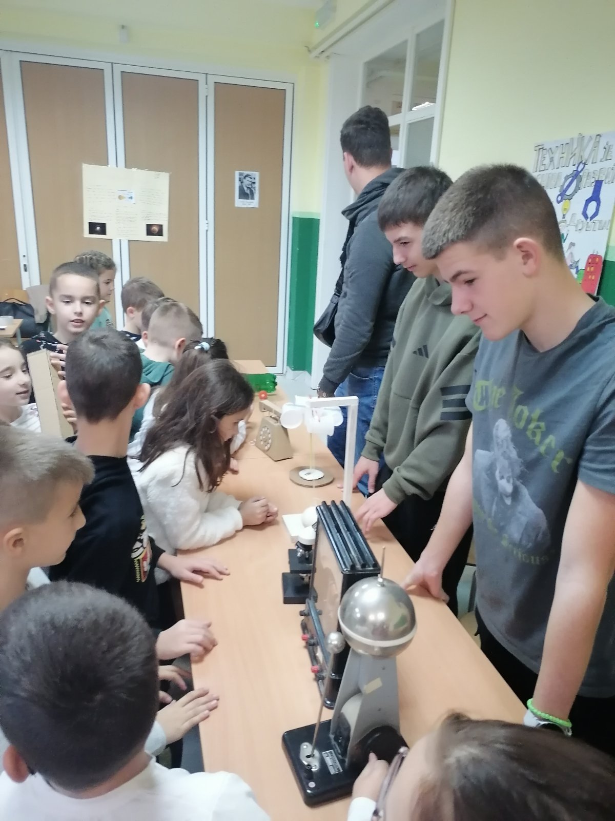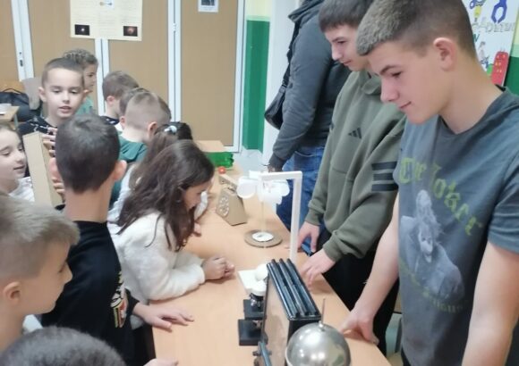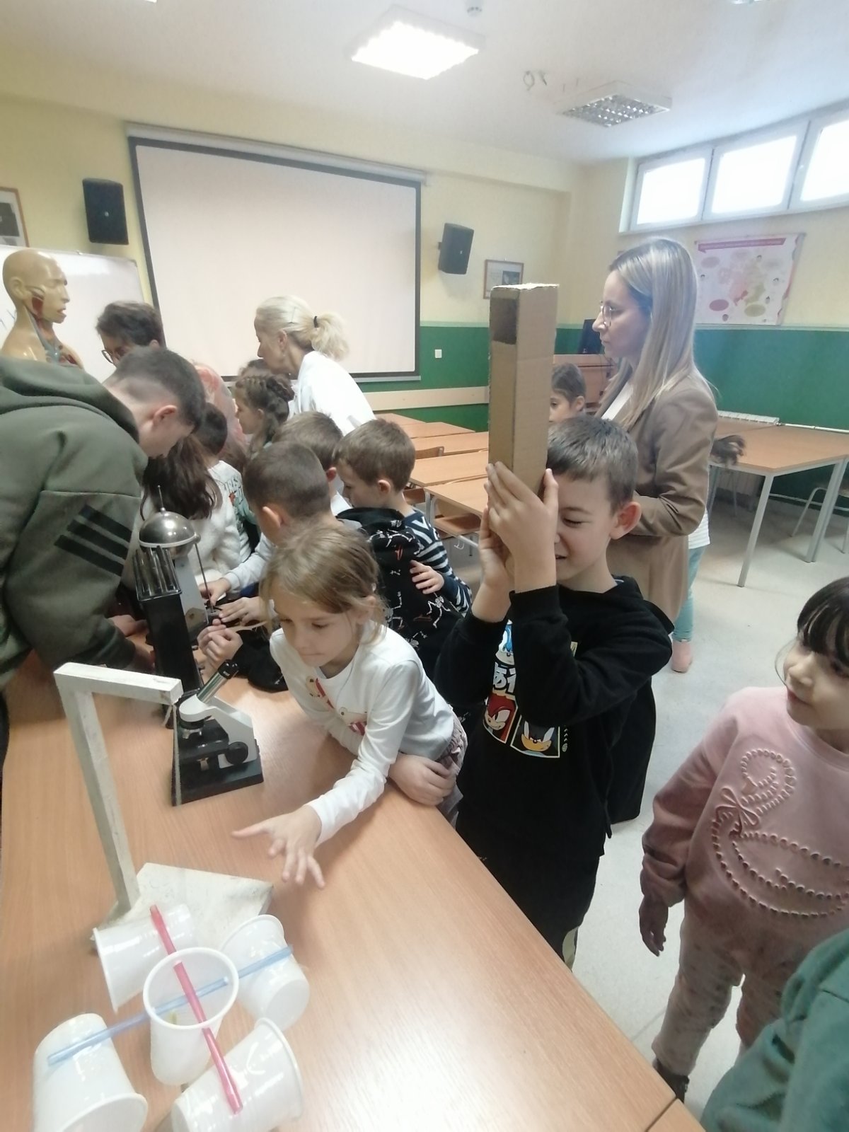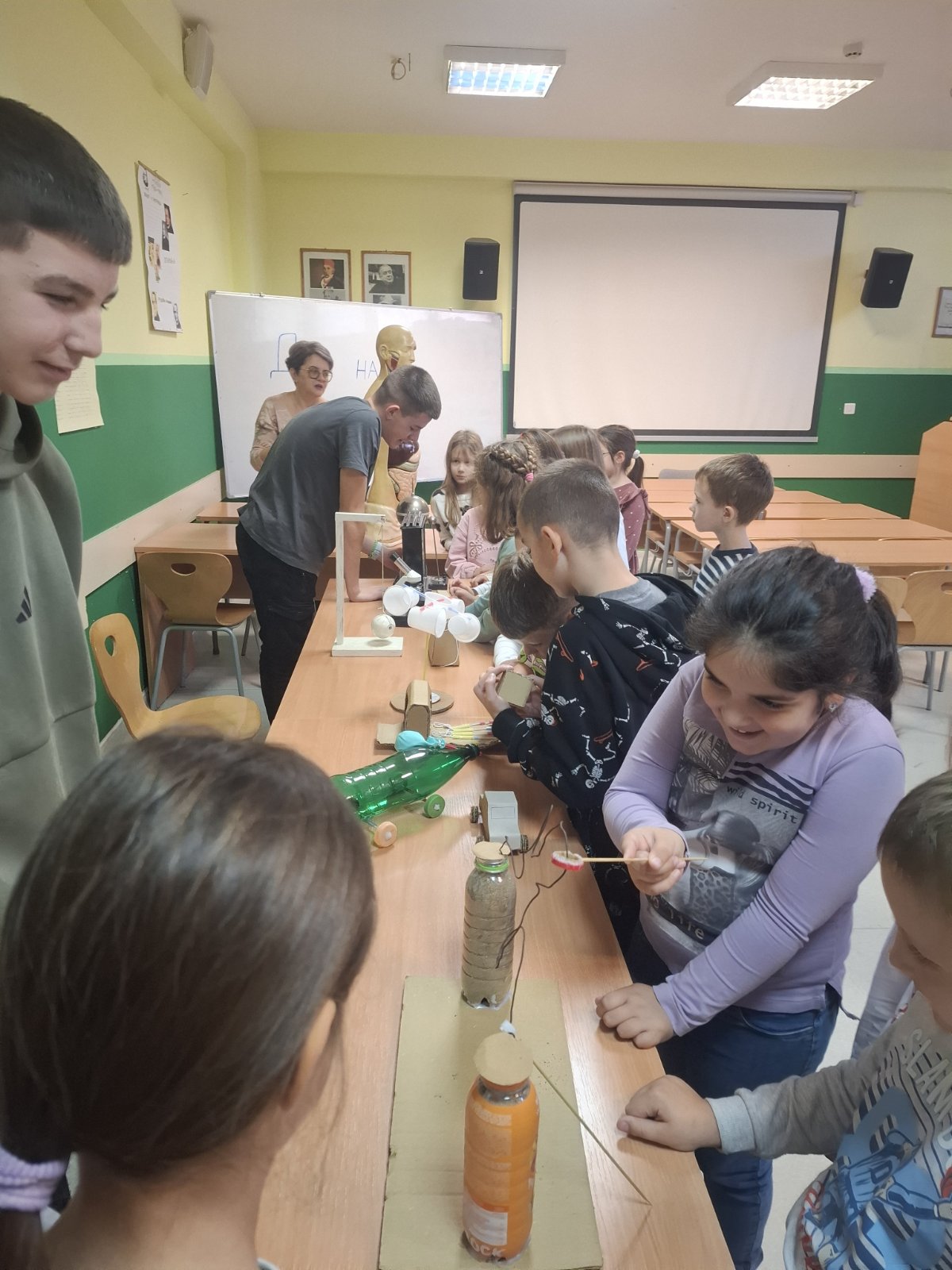 У нашој школи обележили смо Дан науке кроз занимљиве активности за све ученике. Са млађим разредима извођени су узбудљиви експерименти: палили смо магнезијум, правили слонову пасту, чаробно млеко, балон који се сам надувава, лаву у чаши, наелектрисали балоне и померали магнете кроз лавиринт. Деца су такође разгледала изложбу модела направљених од рециклираних материјала: ауто, анемометар, роботску руку, фиксни телефон од картона, као и клатно, перископ, микроскоп и анатомски модел људског тела. Уз велико стрпљење и ангажовање, ученици старијих разреда су демонстрирали рад инструмената и макета, одговарајући на питања млађих и подстичући њихову радозналост. Деца су показала велико интересовање и жељу за извођењем експеримената и разгледањем макета. Све је било забавно, поучно и подстицало дечју радозналост.
