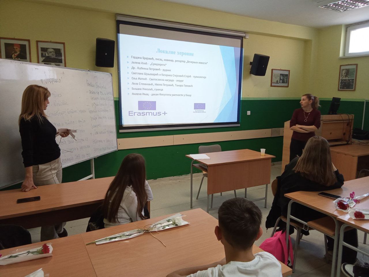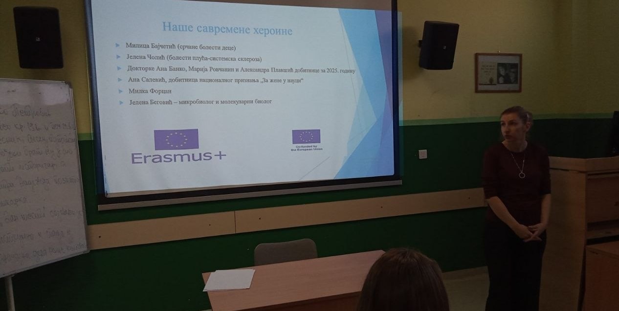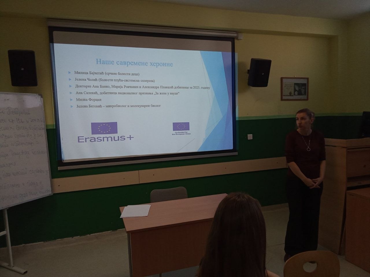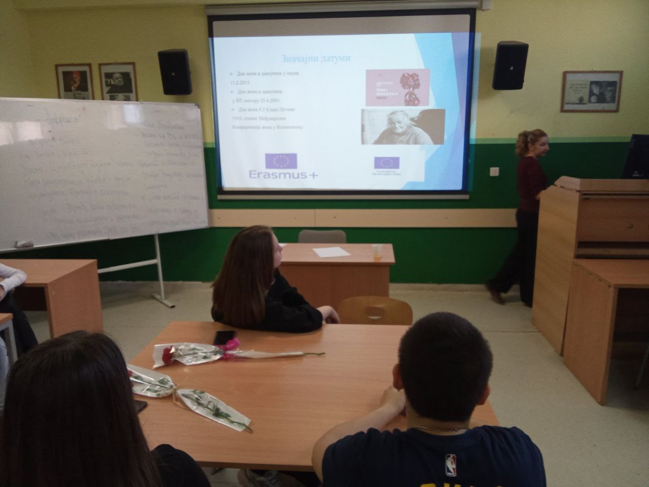 Кроз презентацију ученици су се упознали са историјатом обележавања Дана жена, као и са женама које су покренуле значајне друштвене промене. Посебна пажња посвећена је мање познатим, али изузетно значајним женама чији су успеси блиски и инспиративни младима. Разговарало се о положају жена кроз време и традицију, кроз уметност, али и у модерној кинематографији. Поменуте су и жене које су дале велики допринос развоју науке и друштва у нашој земљи као и о онима које су тренутно кандидати за најпрестижније награде у области научних и медицинских достигнућа.