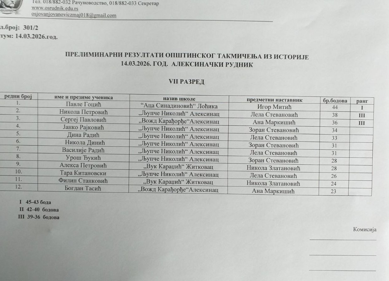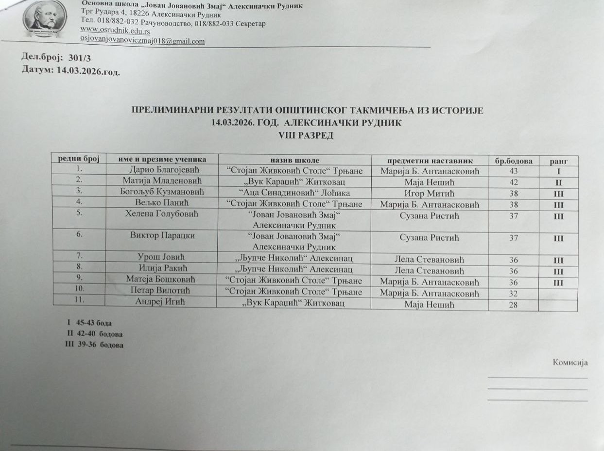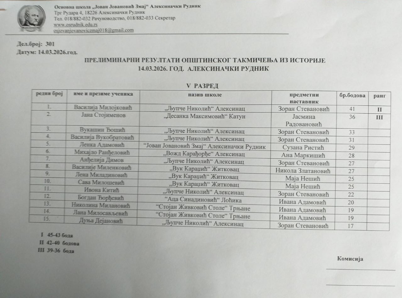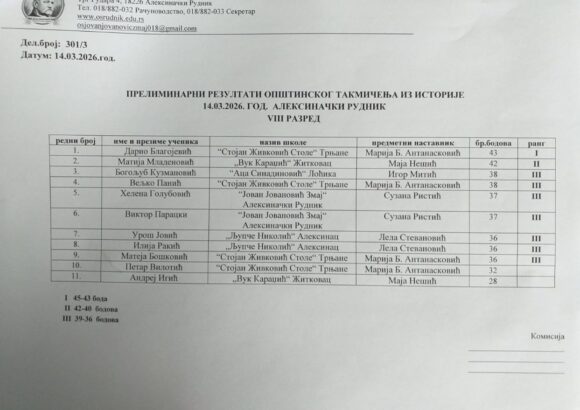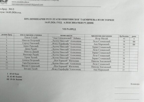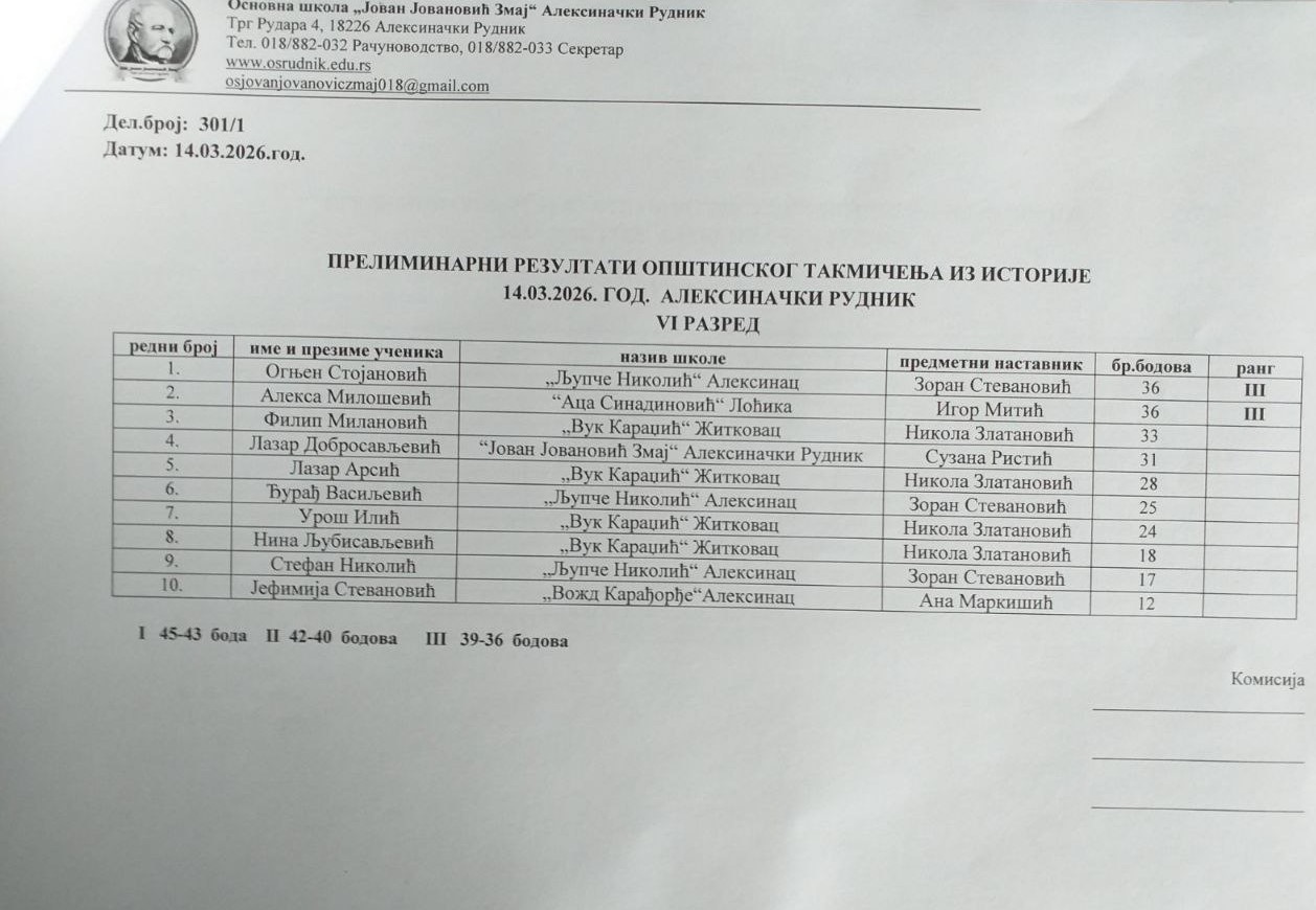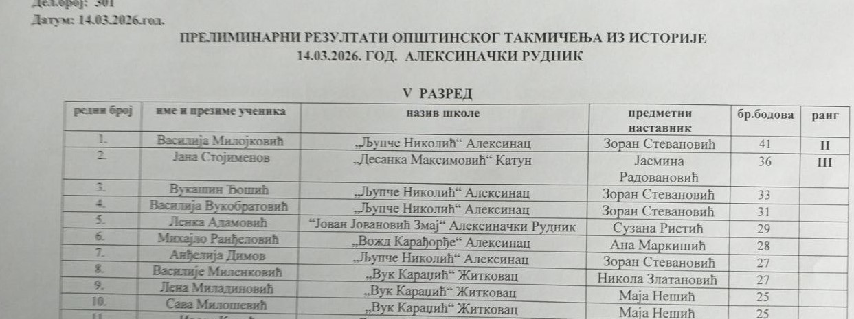 На Општинском такмичењу из историје, одржаном у суботу, 14. марта 2026. године у Основној школи „Јован Јовановић Змај“ у Алексиначком Руднику, учествовало је 18 ученика наше школе, који су остварили веома запажене резултате.