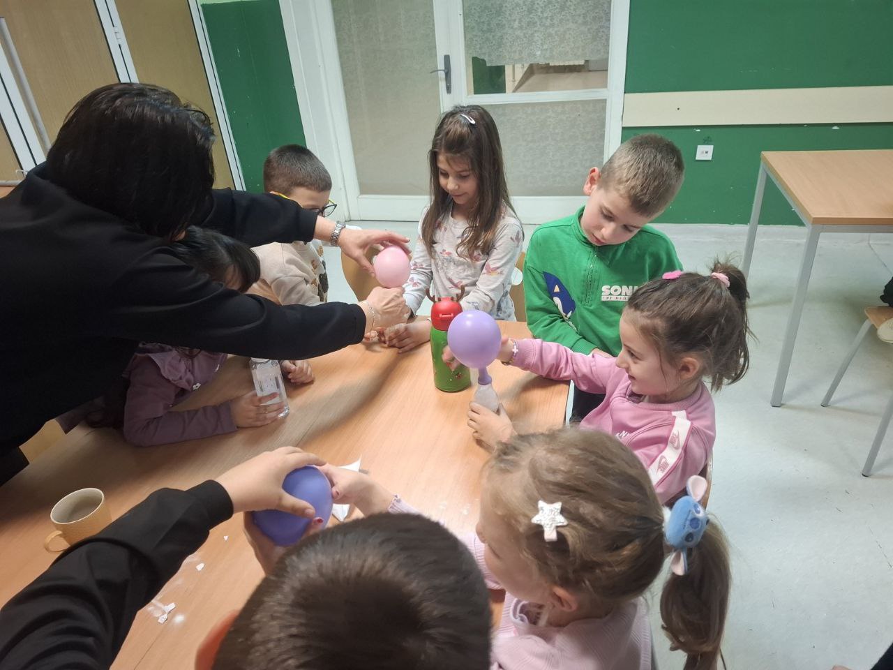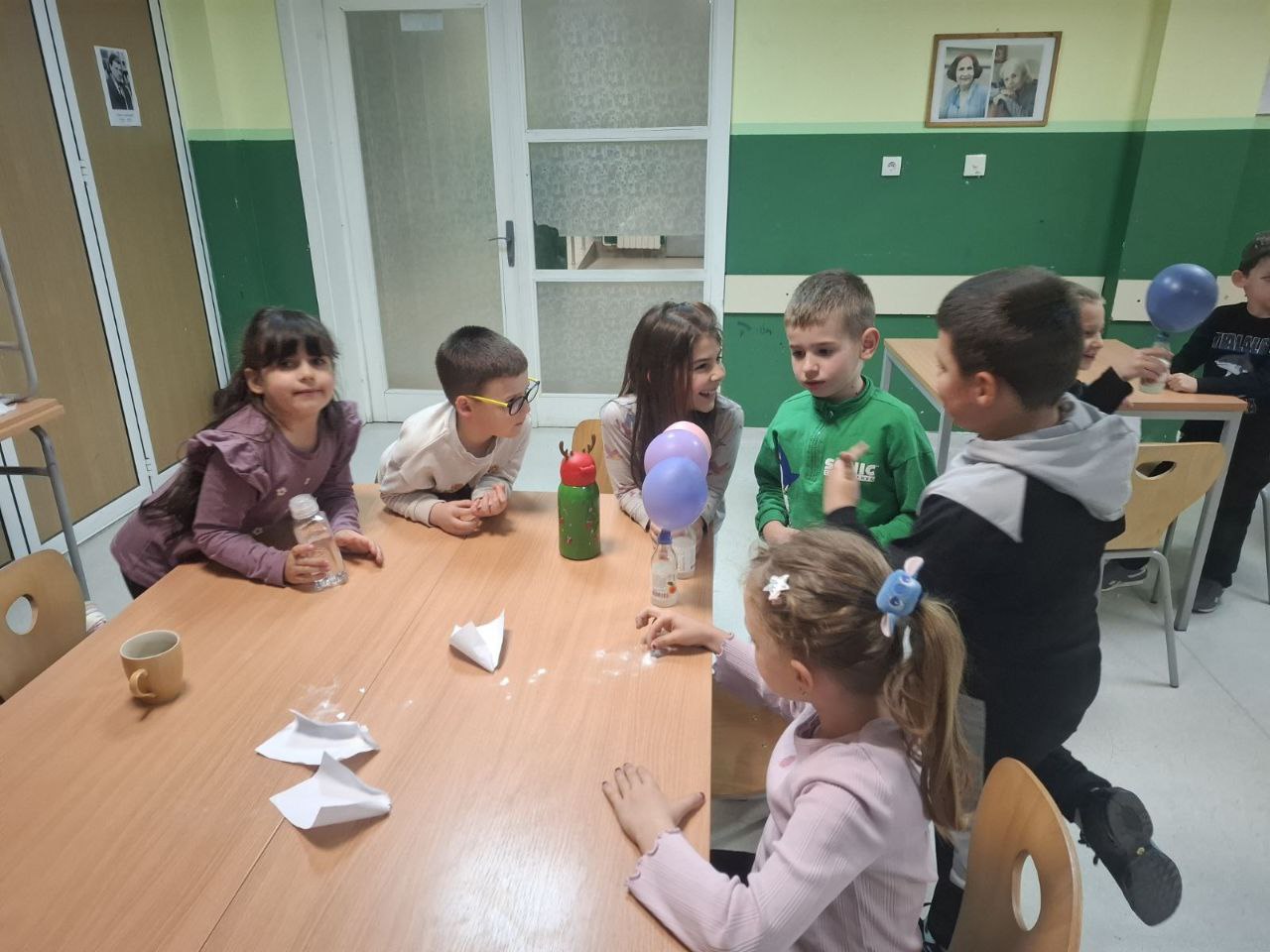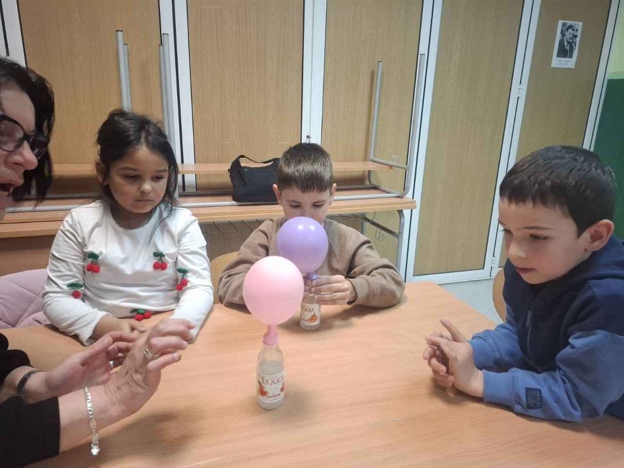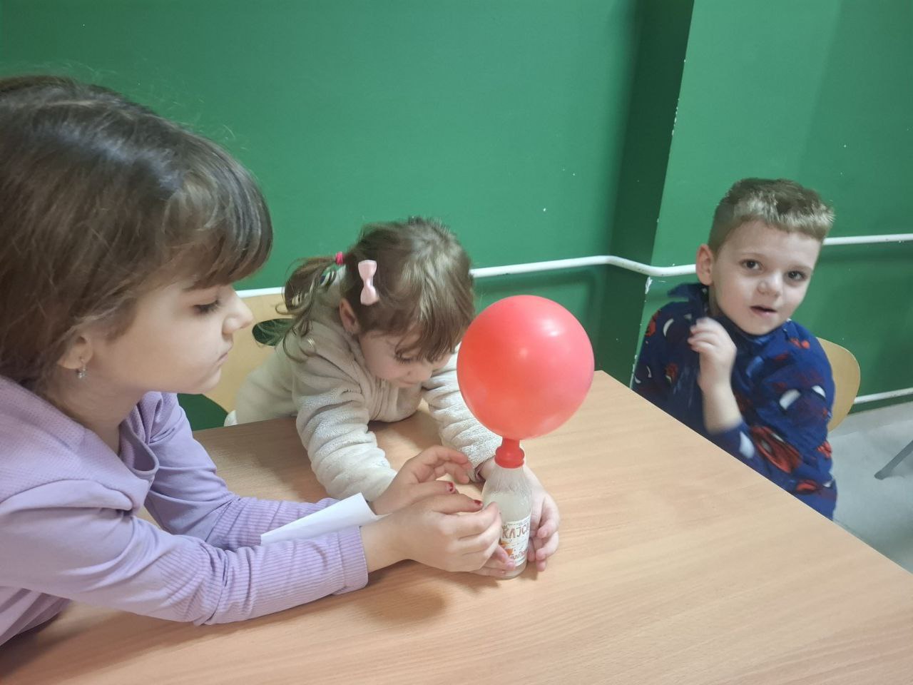 Посебну пажњу посветили смо „невидљивим јунацима“ из ваздуха – кисеонику и угљен-диоксиду. Кроз огледе смо откривали ко ствара кисеоник, зашто нам је неопходан за живот и како помаже сагоревању, иако сам не гори. Са друге стране, угљен-диоксид нас је изненадио својом „супермоћи“ – њиме смо гасили пламен и пунили балоне! Уз много смеха и узбуђења, сваштаоничари су научили да и оно што не видимо може бити веома важно.