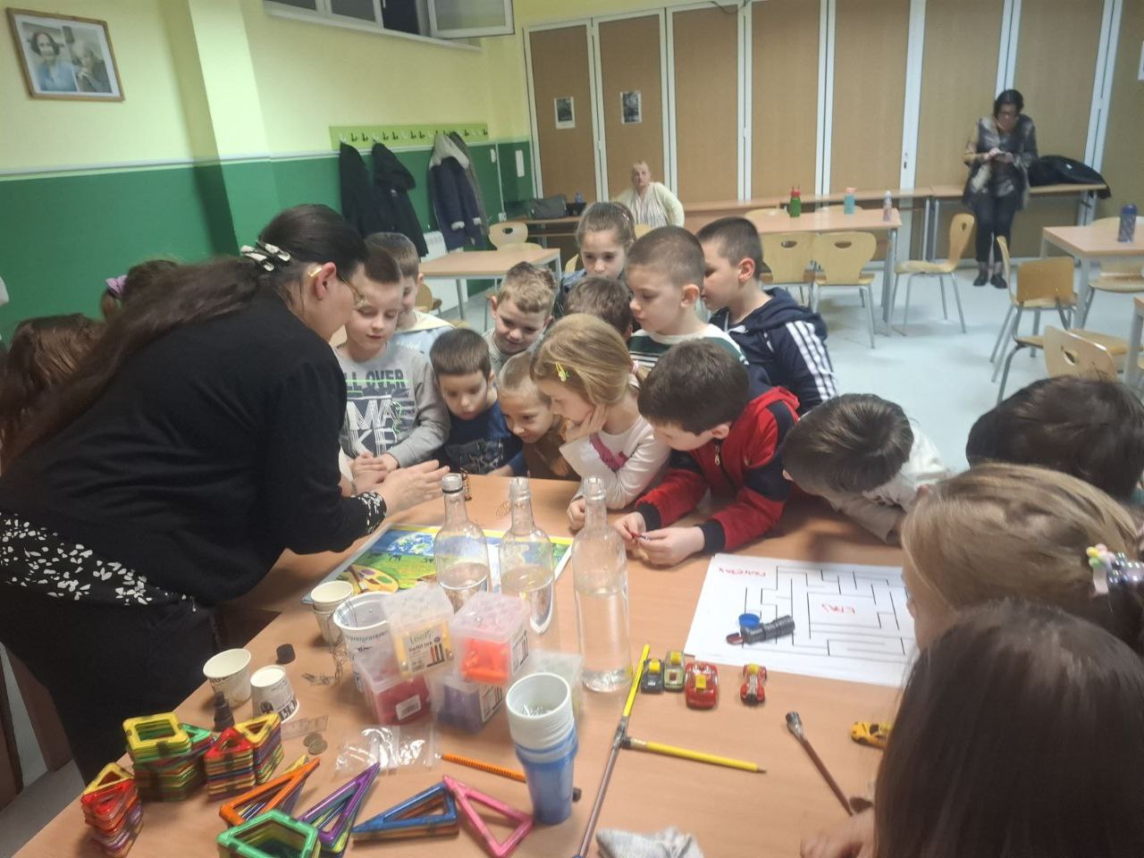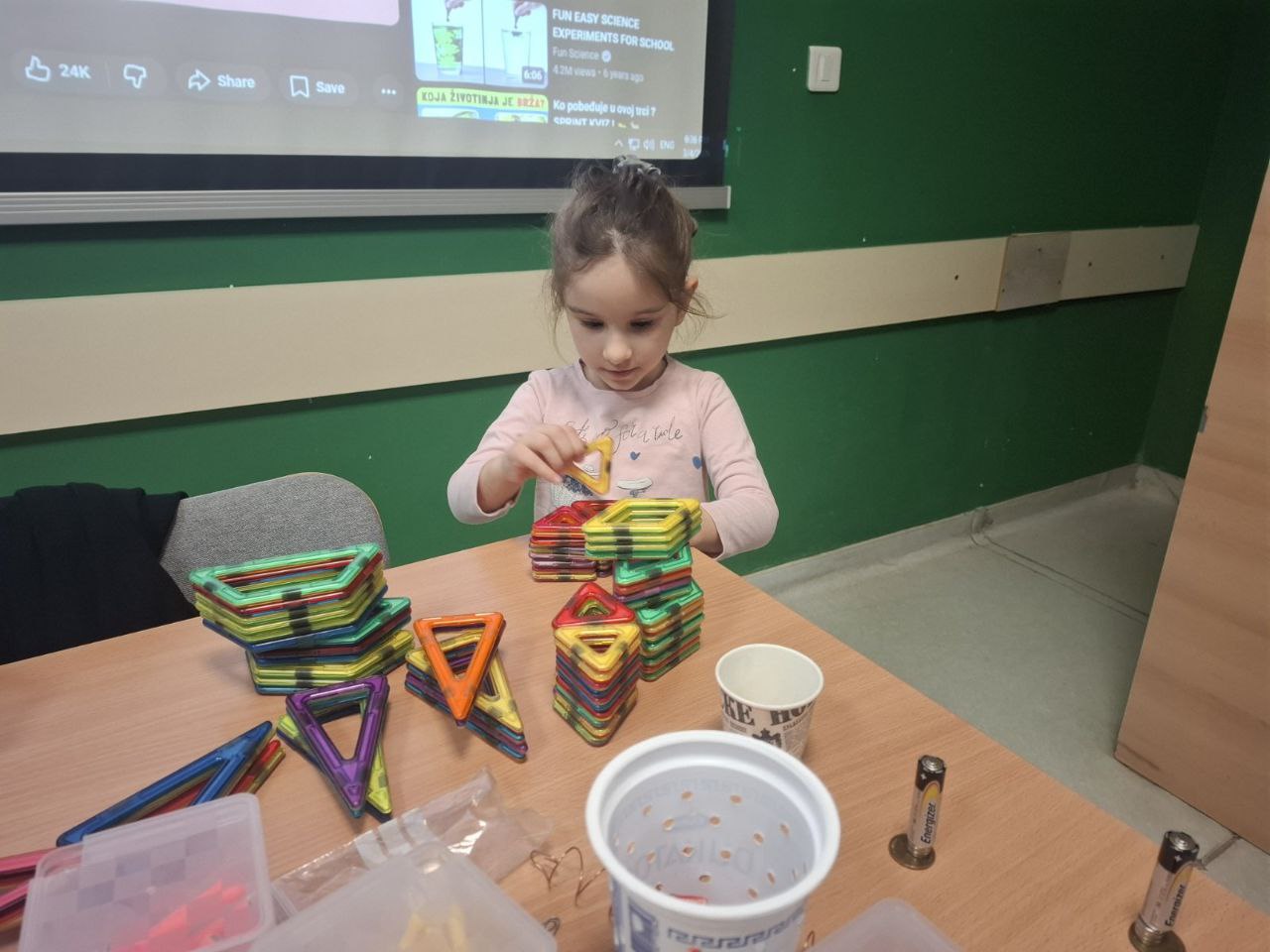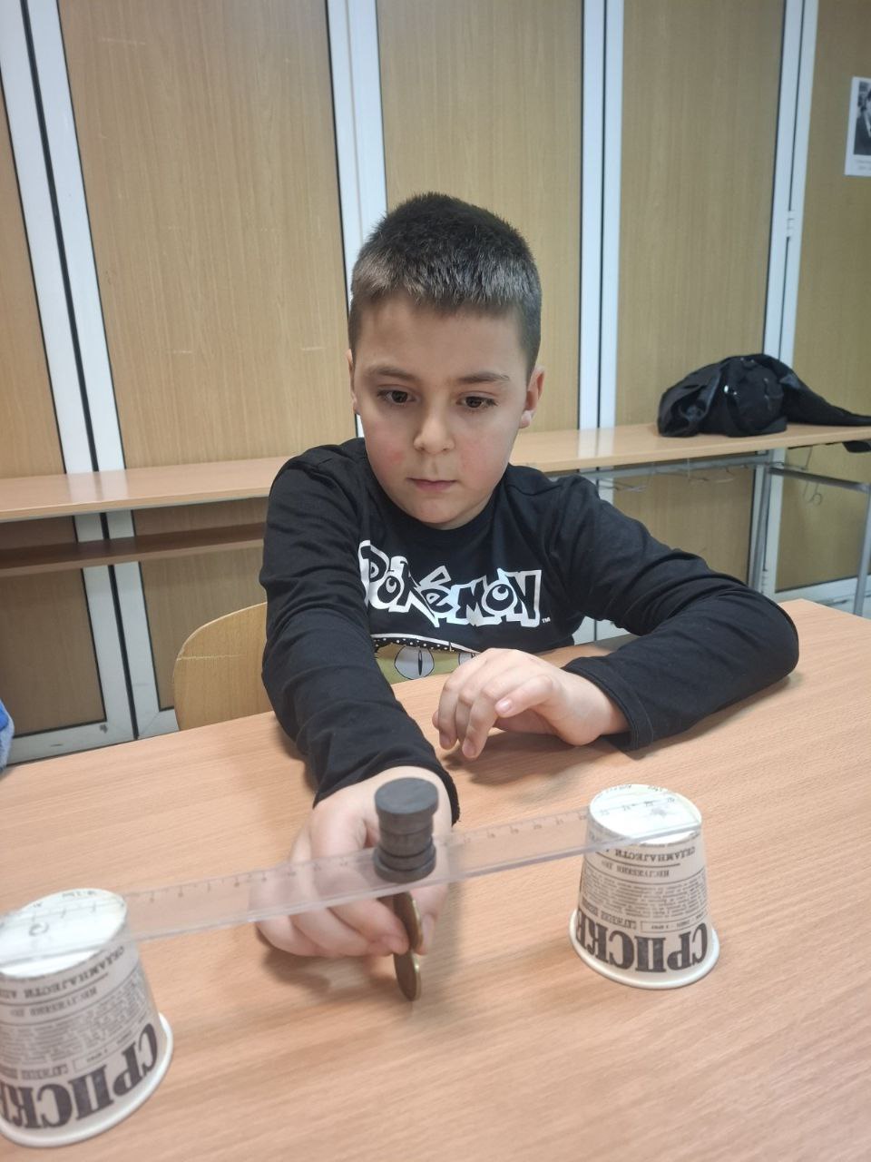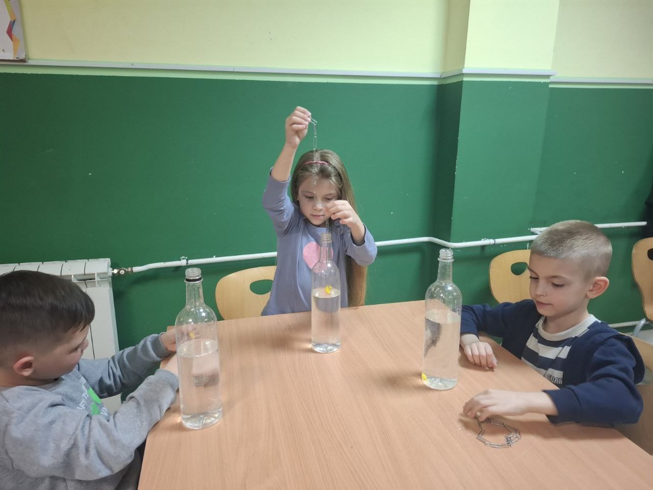 Разговарали смо о томе шта су магнети, како настаје магнетно поље, шта су магнетни полови, зашто се неки предмети привлаче, а неки не реагују на магнет. Посебно занимљиво било је откриће да магнети могу да делују кроз ваздух, воду, па чак и кроз чврсте предмете, што смо одмах проверили кроз низ малих огледа и практичних задатака.